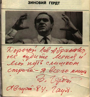 Он называл меня по имени-отчеству, хотя был не только старше, но и на порядок значительней меня, а себя заставлял всех называть еврейским именем «Зяма». Я думаю, это было для него своеобразным тестом: кто стеснялся так к нему обращаться, тот, он считал, испытывал некоторый антисемитский комплекс. Он хотел, чтобы в окружающей его среде его воспринимали таким, каков он есть, без скидок и поблажек на еврейское происхождение. Это был гениальный артист, не только на сцене, но и в жизни, и он сам создавал ситуацию по своему сценарию.Он подарил мне свой буклет с надписью: «Дорогой Лев Абрамович, не судите меня и мой путь слишком строго: - я всего лишь З.Гердт. Август 1984».